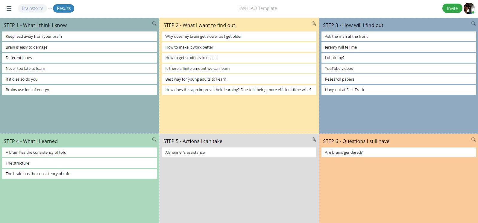 After the learning phase, have students brainstorm what knowledge they have gained and complete the.”L-What I learned” column of the KWHLAQ chart. Ideally, by the end of the study, all the areas in the “W-What I want to know” have been addressed, any misconceptions in column “K- What I know” are clarified, and the students have acquired the knowledge of the subject they want and needed.